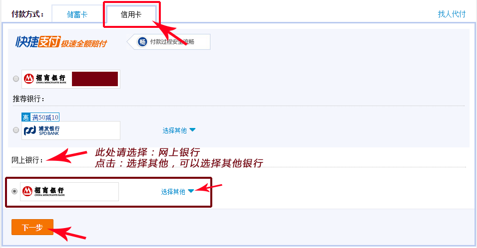 4. 選擇信用卡選項,選擇網(wǎng)上銀行,并選擇對應(yīng)的銀行!如下圖所示!