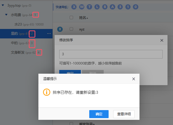 用戶點(diǎn)修改數(shù)字,數(shù)字越小排越前面,不能重復(fù)。公司通信錄按照排序顯示。