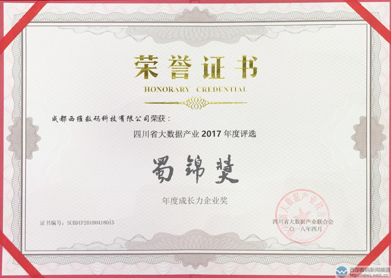 圖:四川省大數(shù)據(jù)產(chǎn)業(yè)2017年度“蜀錦獎(jiǎng)” 西部數(shù)碼獲獎(jiǎng)證書