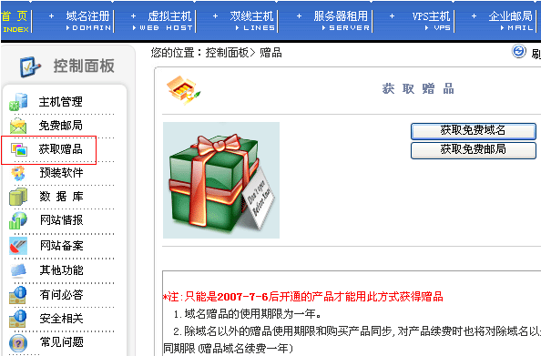 進(jìn)入虛擬主機(jī)管理中心,點擊“獲取贈品”即可在線開通贈送的域名和企業(yè)郵局。
